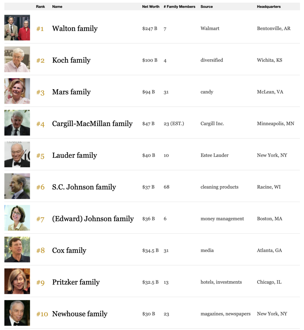 Στην τρίτη θέση βρίσκεται η οικογένεια Koh, η οποία διαχειρίζεται τον βιομηχανικό όμιλο Koch Industries, με περιουσία 124,4 δισεκατομμυρίων, ενώ η πρώτη πεντάδα περιλαμβάνει επίσης την οικογένεια Erme, ιδιοκτήτες του οίκου μόδας Hermes (111,6 δισεκ. δολάρια) και την κυρίαρχη δυναστεία Al-Saud της Σαουδικής Αραβίας (περίπου 100 δισεκ. δολάρια).