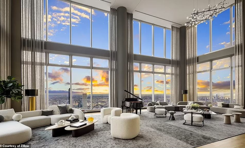 Το εκτεταμένο διαμέρισμα, το οποίο καταλαμβάνει τους τρεις τελευταίους ορόφους του σημαντικότερου κτιρίου των δισεκατομμυριούχων του Μανχάταν, προσφέρει επτά υπνοδωμάτια, οκτώ μπάνια, μαζί με εκπληκτική θέα της πόλης.