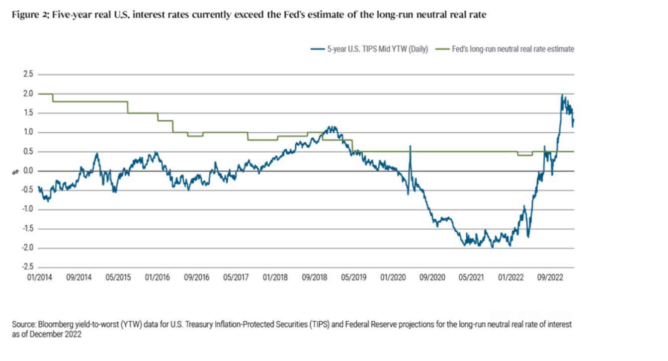 Τα πρόσφατα ευρήματα της FOMC υποδεικνύουν πως η επιτροπή πιστεύει πως το μακροπρόθεσμο επίπεδο των ουδέτερων πραγματικών επιτοκίων (neutral real interest rate) θα πρέπει να κυμανθεί γύρω στο 0,5%, επίπεδο συγκρίσιμο με την απόδοση των προστατευμένων από τον πληθωρισμό 5ετών ομολόγων αμερικανικού δημοσίου (TIPS) του 1,4%. Βάσει των στοιχείων της κεντρικής τράπεζας, τα 5ετή πραγματικά επιτόκια ξεπερνούν τις εκτιμήσεις της Fed για τα ουδέτερα. Η κεντρική τράπεζα θεωρεί την ανισορροπία αυτή ως ένδειξη πως η πολιτική της οδηγεί σε συρρίκνωση της οικονομίας λόγω επιβράδυνσης της συνολικής ζήτησης και άσκησης καθοδικών πιέσεων στον πληθωρισμό. Η Fed θα προσπαθήσει να διαχειριστεί τα επιτόκια βάσει των εκτιμήσεων των γενικότερων χρηματοοικονομικών δεδομένων και όχι μόνο βάσει των στόχων των neutral rates.