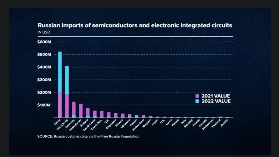 Το 2022 η Κίνα πούλησε ημιαγωγούς αξίας άνω των $500 εκατ. στη Ρωσία, σε σχέση με τα $200 εκατ. το 2021. Την ίδια στιγμή η Κίνα εξήγαγε drones αξίας άνω των $12 εκατομμυρίων στη Ρωσία από τον Μάρτιο του 2022 μέχρι αυτόν του 2023.