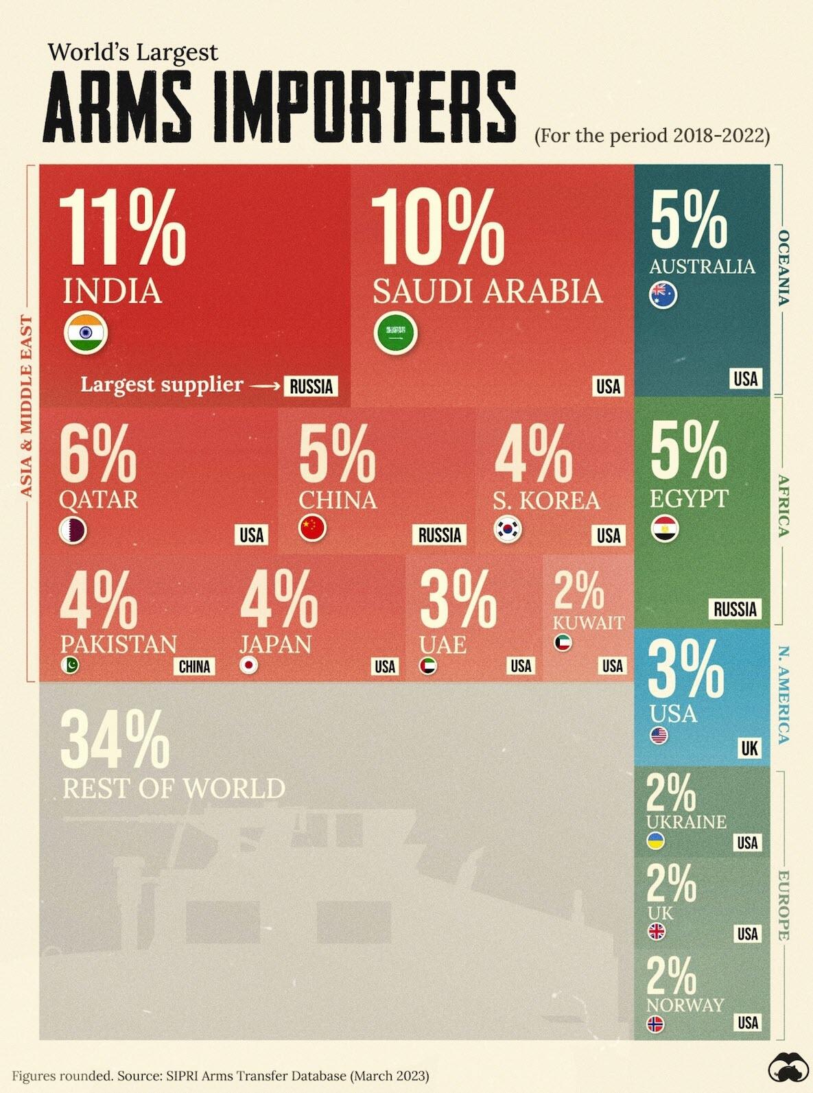 Η Ινδία κατέχει την πρώτη θέση όσον αφορά την εισαγωγή όπλων στο 11% μεταξύ του 2018 και του 2022. H πέμπτη μεγαλύτερη οικονομία του κόσμου έχει τον τέταρτο μεγαλύτερο στρατιωτικό προϋπολογισμό, ενώ βασίζεται στη Ρωσία για την προμήθεια του μεγαλύτερου μέρους των αναγκών της σε οπλισμό, με τη Γαλλία και τις ΗΠΑ να ακολουθούν τους Ρώσους από κοντά.