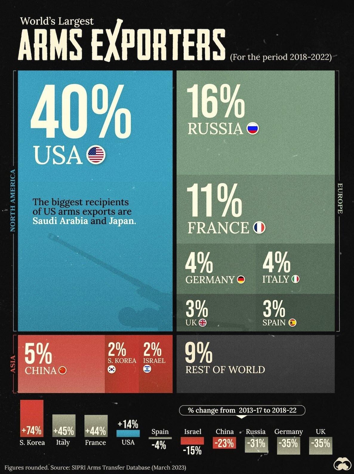 Οι Ηνωμένες Πολιτείες της Αμερικής αποτελούν και τον μεγαλύτερο εξαγωγέα οπλικών συστημάτων, αντιπροσωπεύοντας το 40% του συνόλου μεταξύ του 2018 και του 2022.