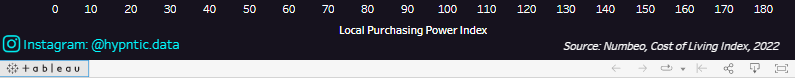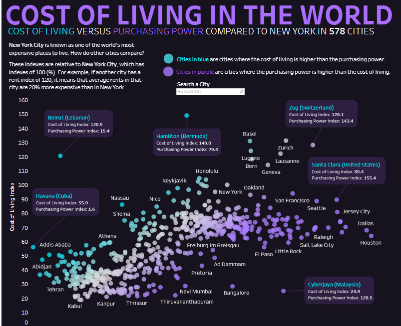 Το πως ωστόσο συγκρίνονται τα καθημερινά έξοδα, σε μέρη όπως η Αθήνα, η Βηρυτός, ο Λίβανος αποκαλύπτει το παρακάτω διάγραμμα του hypntic.data όπου συγκρίνει το κόστος ζωής και την αγοραστική δύναμη σε 578 διαφορετικές πόλεις, χρησιμοποιώντας τη Νέα Υόρκη ως σημείο αναφοράς για σύγκριση.