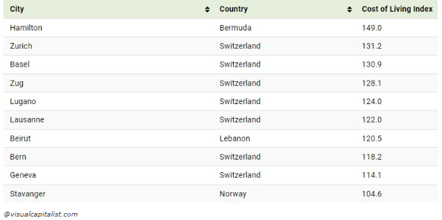 Η πρωτεύουσα των Βερμούδων Χάμιλτον κατατάσσεται πρώτη στη λίστα, με κόστος ζωής που είναι σχεδόν 50% υψηλότερο από αυτό της Νέας Υόρκης.
