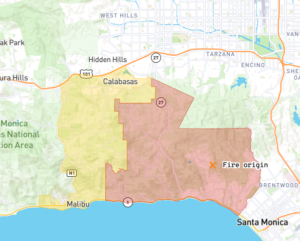 Η πυρκαγιά εκδηλώθηκε καθώς στο Λος Άντζελες πνέουν άνεμοι με μεγάλη ταχύτητα. Πρόκειται για τους θερμούς ανέμους της Σάντα Άνα, συνηθισμένους τον καλιφορνέζικο χειμώνα, που φθάνουν ως και τα 160 χιλιόμετρα ανά ώρα, σύμφωνα με την αμερικανική μετεωρολογική υπηρεσία (NWS).
