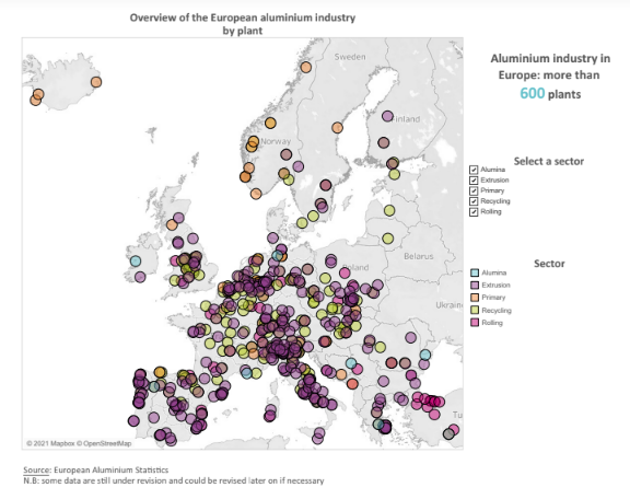 Η βιομηχανία αλουμινίου στην Ευρώπη μετρά πάνω από 600 εργοστάσια που δίνουν δουλειά σε 3,6 εκατομμύρια εργαζόμενους.