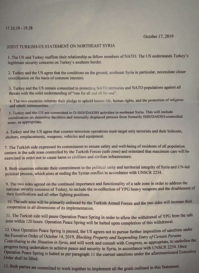 11. Η Τουρκία θα παύσει την Επιχείρηση Πηγή Ειρήνης με στόχο να επιτραπεί η απόσυρση των YPG από την Ασφαλή Ζώνη μέσα σε 120 ώρες. Η Επιχείρηση Πηγή Ειρήνης θα σταματήσει μέχρι την ολοκλήρωση της υποχώρησης.