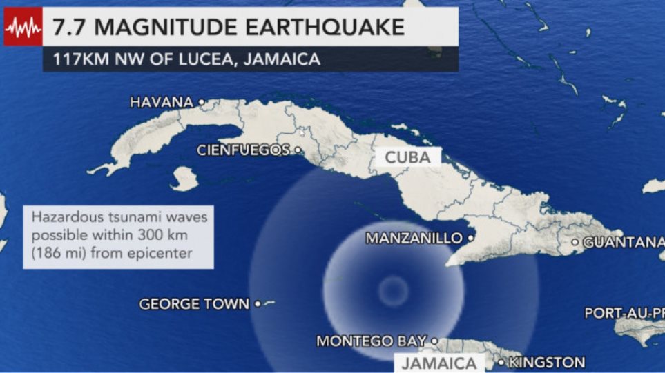 Σεισμική δόνηση μεγέθους 7,7 βαθμών σημειώθηκε 117 χιλιόμετρα βορειοδυτικά της παραθαλάσσιας πόλης Λούσεα στην Τζαμάικα, έγινε γνωστό από το αμερικανικό Γεωλογικό Ινστιτούτο (USGS).