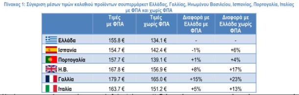 Η εικόνα των αποτελεσμάτων αλλάζει σημαντικά όταν αφαιρεθεί ο ΦΠΑ ανά χώρα, για να γίνουν αντιληπτές οι πραγματικές τιμές των προϊόντων σουπερμάρκετ. Η σύγκριση των καλαθιών σε αυτή την περίπτωση δείχνει ότι και οι έξι χώρες έχουν πιο ακριβό μέσο καλάθι από την Ελλάδα, η Γαλλία κατά 23%, το Ηνωμένο Βασίλειο κατά 17%, η Ιταλία κατά 13%, η Ισπανία κατά 6% και η Πορτογαλία κατά 4%.