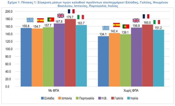 Ειδικότερα, η σύγκριση των μέσων τιμών των καλαθιών δείχνει ότι και οι τρεις χώρες έχουν σημαντικά ακριβότερο μέσο καλάθι από την Ελλάδα, 15% η Γαλλία, 8% το Ηνωμένο Βασίλειο, 5% η Ιταλία, ενώ οι άλλες δύο χώρες έχουν περίπου ίσο καλάθι με την Ελλάδα 1% ακριβότερο η Πορτογαλία και 1% φθηνότερο η Ισπανία.
