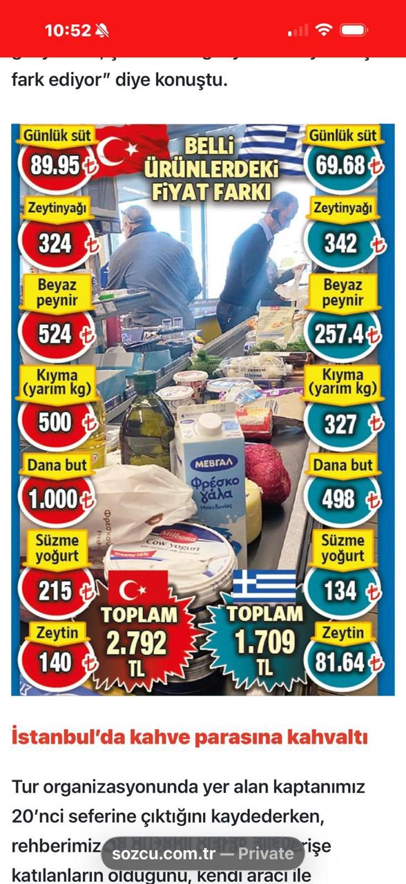 Η ζήτηση είναι τέτοια, ώστε τα δρομολόγια με προορισμό την Ελλάδα –ακόμη και για αγορές όπως ο βοδινός κιμάς– έχουν αυξηθεί σε δύο φορές την εβδομάδα. Στο πλαίσιο μιας τέτοιας εκδρομής συμμετείχε και ανταποκριτής της Sozcu, ο οποίος αγόρασε τρόφιμα καθημερινής κατανάλωσης, μεταξύ των οποίων κρέας, γάλα και ζυμαρικά. Το ίδιο ακριβώς καλάθι, που στην Τουρκία θα κόστιζε 3.709 λίρες (71,94 Ευρώ), στην Ελλάδα τιμολογήθηκε στις 2.433 λίρες (47,19 Ευρώ).