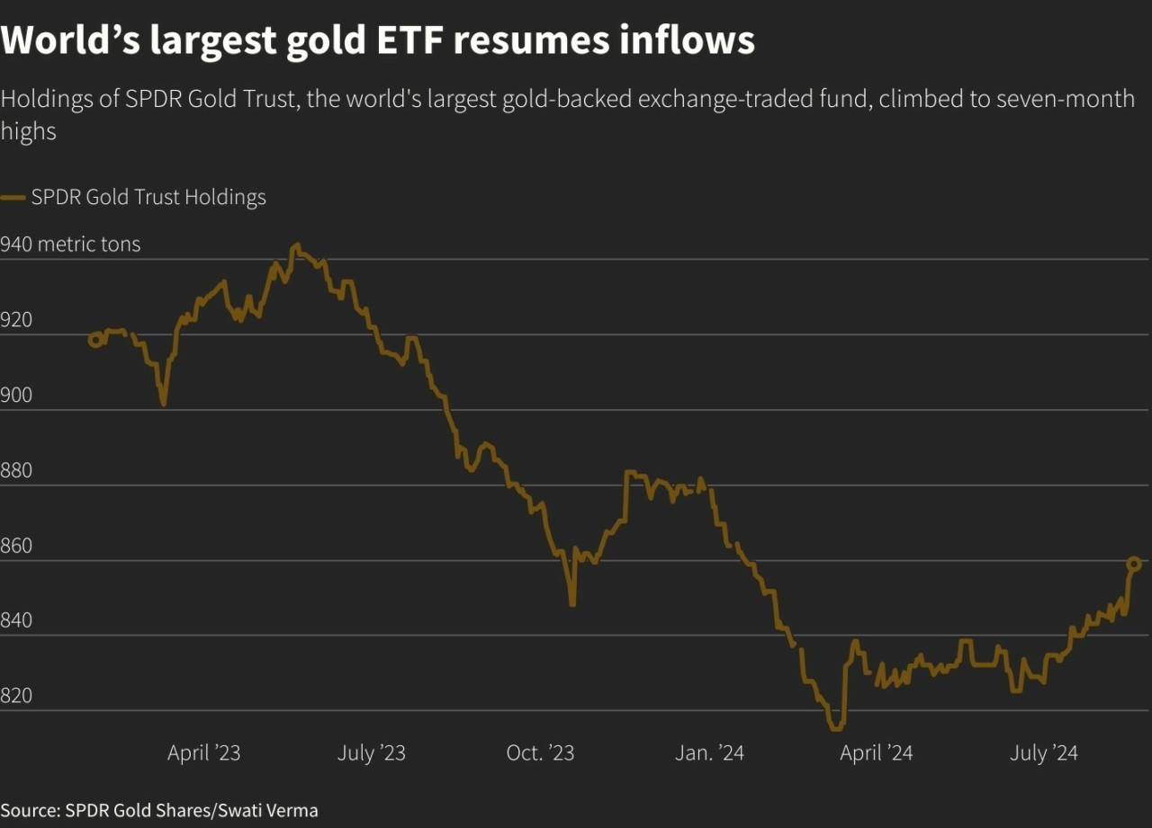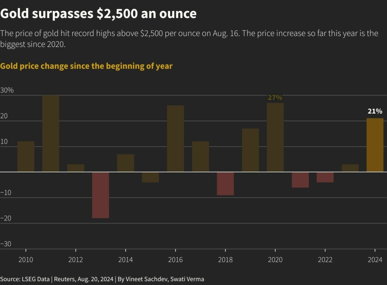 Οι τιμές του χρυσού έχουν σημειώσει ράλι άνω του 20% μέχρι στιγμής φέτος, λόγω της αισιοδοξίας ότι η Fed θα αρχίσει να μειώνει τα επιτόκια τον Σεπτέμβριο, όπως επίσης και λόγω των ισχυρών αγορών από τις κεντρικές τράπεζες και της ζήτησης ασφαλούς καταφυγίου που απορρέει από τις εντάσεις στη Μέση Ανατολή.