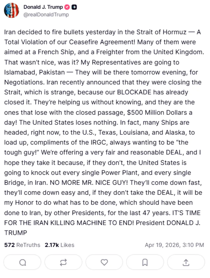 «Το Ιράν αποφάσισε χθες να ρίξει πυροβολισμούς στο Στενό του Ορμούζ — Μια πλήρης παραβίαση της συμφωνίας κατάπαυσης του πυρός που έχουμε συνάψει! Πολλοί από αυτούς στόχευαν ένα γαλλικό πλοίο και ένα φορτηγό πλοίο από το Ηνωμένο Βασίλειο. Δεν ήταν και πολύ ωραίο αυτό, έτσι; Οι εκπρόσωποί μου πηγαίνουν στο Ισλαμαμπάντ του Πακιστάν — θα βρίσκονται εκεί αύριο το βράδυ, για διαπραγματεύσεις. Το Ιράν ανακοίνωσε πρόσφατα ότι θα κλείσει το Στενό, κάτι που είναι παράξενο, επειδή ο ΑΠΟΚΛΕΙΣΜΟΣ μας το έχει ήδη κλείσει. Μας βοηθούν χωρίς να το γνωρίζουν, και είναι αυτοί που χάνουν από το κλειστό πέρασμα, 500 εκατομμύρια δολάρια την ημέρα! Οι Ηνωμένες Πολιτείες δεν χάνουν τίποτα. Στην πραγματικότητα, πολλά πλοία κατευθύνονται, αυτή τη στιγμή, προς τις ΗΠΑ, το Τέξας, τη Λουιζιάνα και την Αλάσκα, για να φορτωθούν, χάρη στο IRGC, που θέλει πάντα να είναι «ο σκληρός τύπος»! Προσφέρουμε μια πολύ δίκαιη και λογική ΣΥΜΦΩΝΙΑ, και ελπίζω να την αποδεχθούν, γιατί, αν δεν το κάνουν, οι Ηνωμένες Πολιτείες θα καταστρέψουν κάθε μονάδα παραγωγής ηλεκτρικής ενέργειας και κάθε γέφυρα στο Ιράν. ΤΕΛΟΣ Ο Κ. ΚΑΛΟΣ! Θα πέσουν γρήγορα, θα πέσουν εύκολα και, αν δεν δεχτούν τη ΣΥΜΦΩΝΙΑ, θα είναι τιμή μου να κάνω ό,τι πρέπει να γίνει, κάτι που θα έπρεπε να είχαν κάνει άλλοι Πρόεδροι στο Ιράν τα τελευταία 47 χρόνια. ΕΙΝΑΙ ΩΡΑ ΝΑ ΤΕΡΜΑΤΙΣΤΕΙ Η ΜΗΧΑΝΗ ΘΑΝΑΤΟΥ ΤΟΥ ΙΡΑΝ! Πρόεδρος ΝΤΟΝΑΛΝΤ ΤΡΑΜΠ».