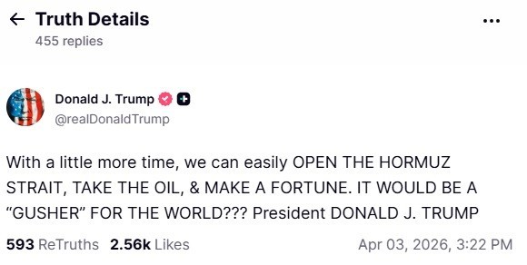 «Με λίγο περισσότερο χρόνο, μπορούμε εύκολα να ΑΝΟΙΞΟΥΜΕ τα Στενά του Ορμούζ, να πάρουμε το πετρέλαιο και να αποκομίσουμε μια περιουσία. Θα ήταν μια “πηγή πλούτου” για τον κόσμο», ανέφερε χαρακτηριστικά.