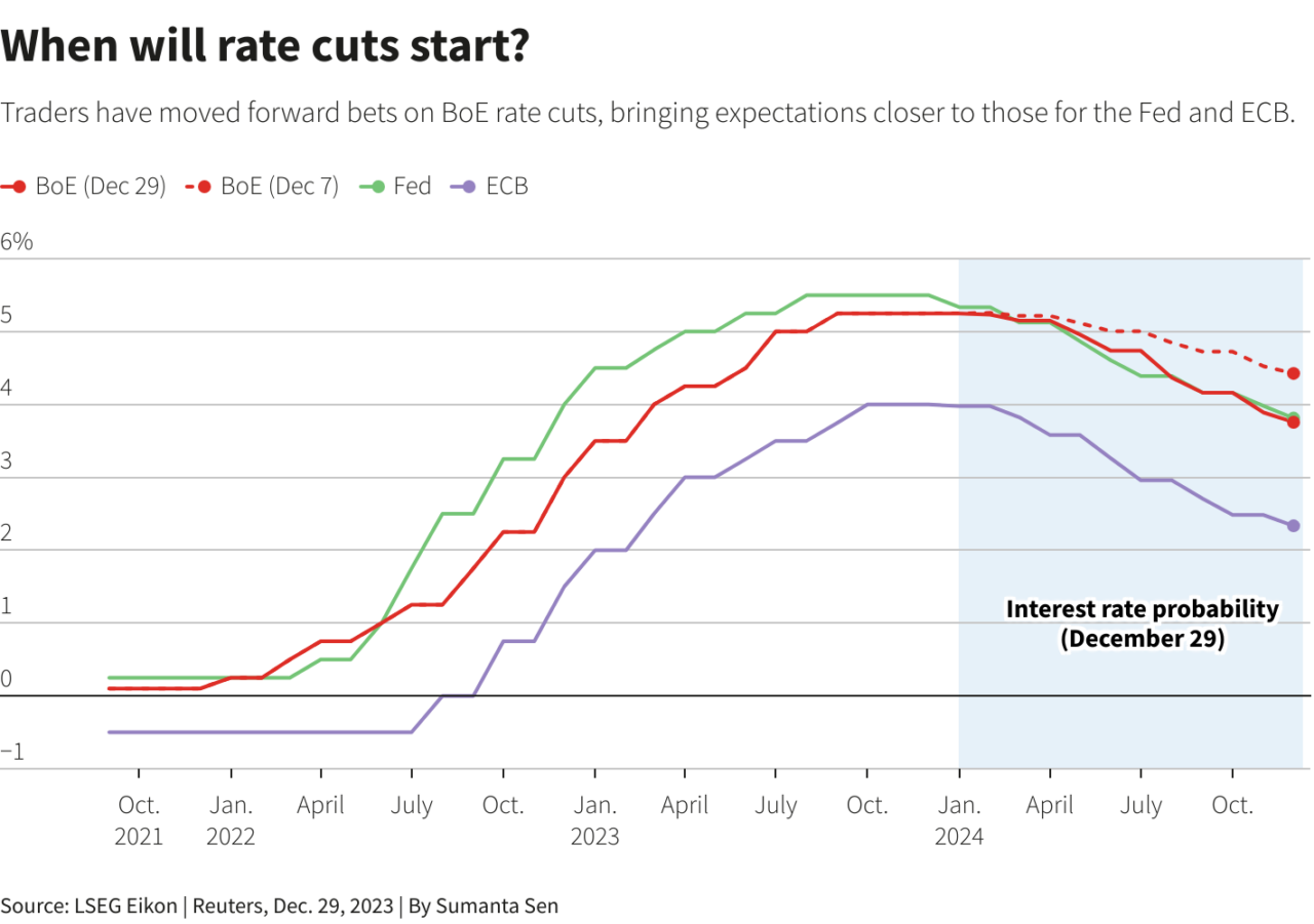 Τα στοιχεία αυτά ωθούν τους επενδυτές να επισπεύσουν τις προσδοκίες τους όσον αφορά την πρώτη μείωση των επιτοκίων της ΒοΕ, με τις αγορές να τιμολογούν πλέον μία μείωση κατά 25 μονάδες βάσης τον ερχόμενο Μάιο, σε σχέση με τις προηγούμενες εκτιμήσεις του Αυγούστου.