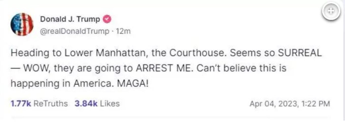 Kαθ’οδόν προς το δικαστήριο, ο Τραμπ έγραψε στην πλατφόρμα που έχει στα κοινωνικά δίκτυα, Truth Social τα εξής: «Πηγαίνοντας στο δικαστήριο του Μανχάταν. Μοιάζει τόσο σουρεαλιστικό. Ουάου, θα με συλλάβουν, δεν το πιστεύω. Δεν πιστεύω ότι αυτό συμβαίνει στην Αμερική. Κάντε την Αμερική ξανά σπουδαία (MAGA)».