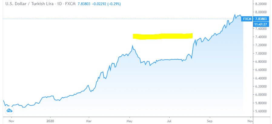 Ο πακτωλός δολαρίων από το Κατάρ παρείχε φρέσκα πυρομαχικά στην κεντρική τράπεζα του Ερντογάν, η οποία με ισχυρές παρεμβάσεις στην αγορά συναλλάγματος, κατάφερε από το Μάιο να βελτιώσει ραγδαία την ισοτιμία της λίρας και να της χαρίσει μια σταθερή ισοτιμία για περίπου δυο μήνες, στο 6,85.