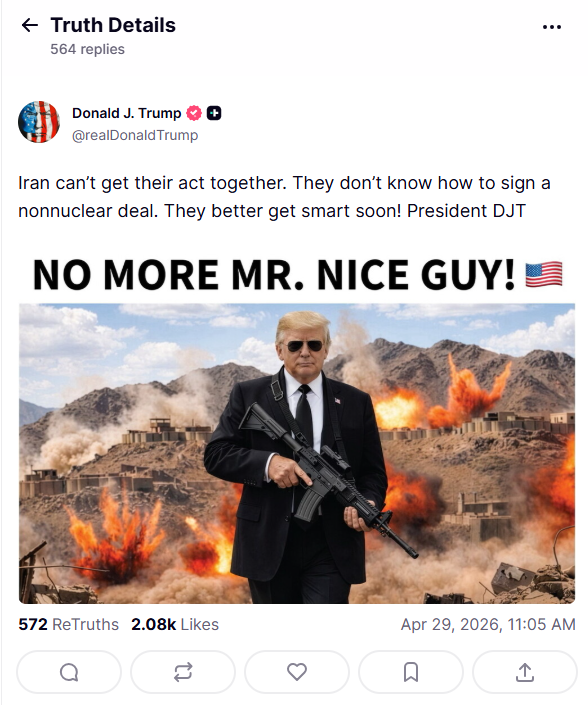 Με τη φράση «No more Mr Nice Guy» (τέρμα πια το καλό παιδί), τη μορφή του να κρατά όπλο μπροστά από ένα βουνό στο οποίο γίνονται εκρήξεις και αιχμές στην αδυναμία της ιρανικής κυβέρνησης να φτάσει σε συμφωνία για το πυρηνικό της πρόγραμμα, «χτύπησε» ο Ντόναλντ Τραμπ σε ανάρτηση που ανέβασε στο Truth Social.