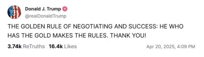 Ο ίδιος ο Τραμπ πριν από λίγες εβδομάδες δημοσίευσε τον «χρυσό κανόνα» του με κεφαλαία γράμματα στον λογαριασμό του Truth Social.