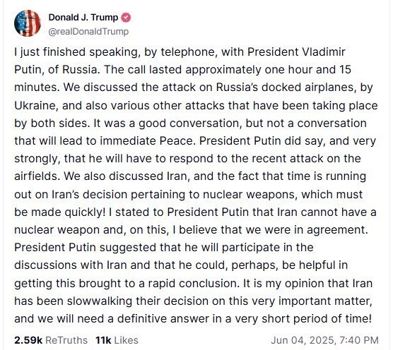 Ο Πρόεδρος των Ηνωμένων Πολιτειών Ντόναλντ Τραμπ δήλωσε την Τετάρτη ότι συνομίλησε με τον Ρώσο πρόεδρο Βλαντίμιρ Πούτιν για περισσότερο από μία ώρα σχετικά με τη νέα ουκρανική επίθεση κατά ρωσικών αεροσκαφών, καθώς και για τις συνομιλίες για το πυρηνικό πρόγραμμα του Ιράν.
