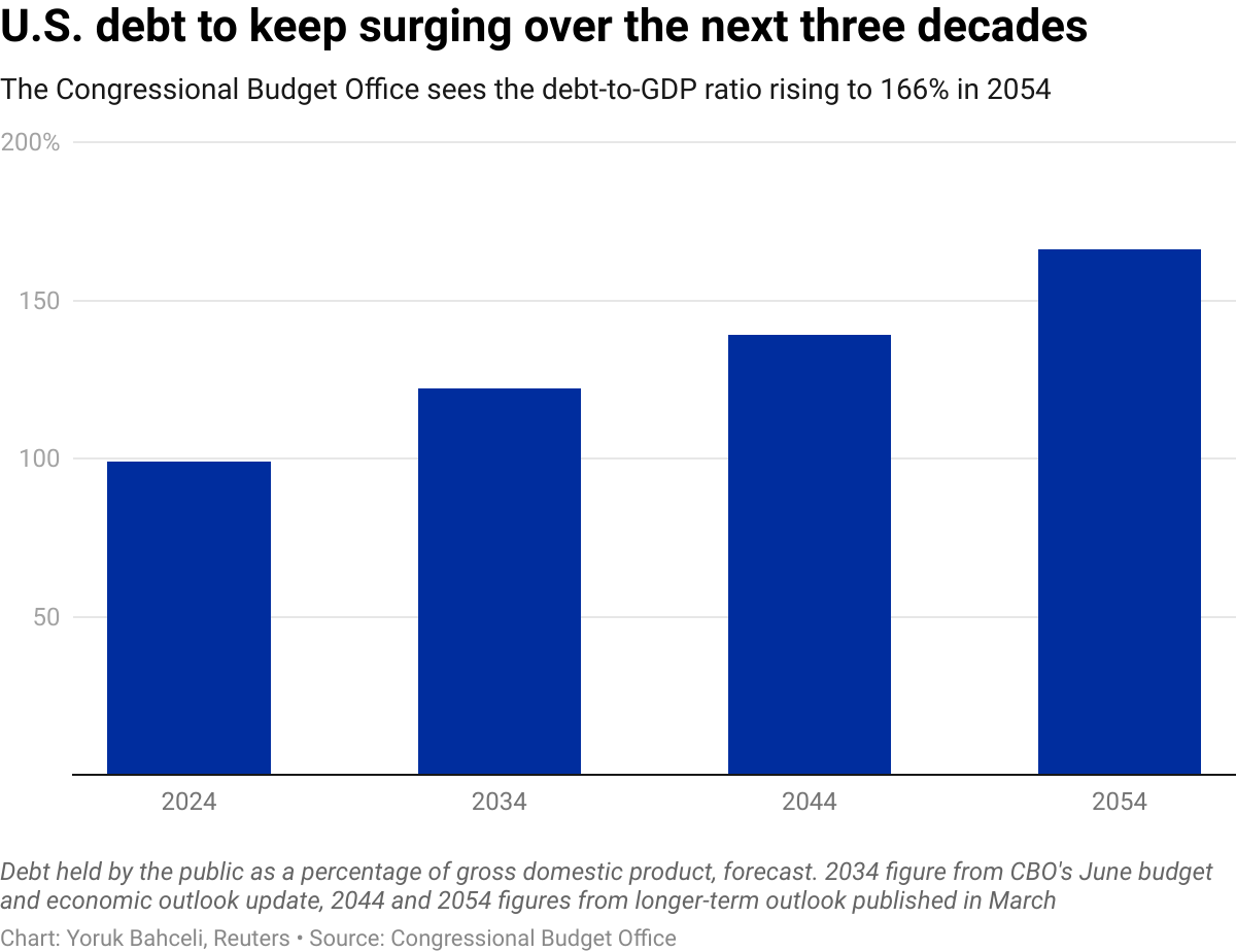 Οι ΗΠΑ δεν βρίσκονται πολύ πίσω από την Γαλλία. Το Γραφείο Προϋπολογισμού του Κογκρέσου υπολογίζει ότι το δημόσιο χρέος θα αυξηθεί από το 97% στο 122% της παραγωγής έως το 2034 – υπερδιπλάσιο του μέσου όρου από το 1994.