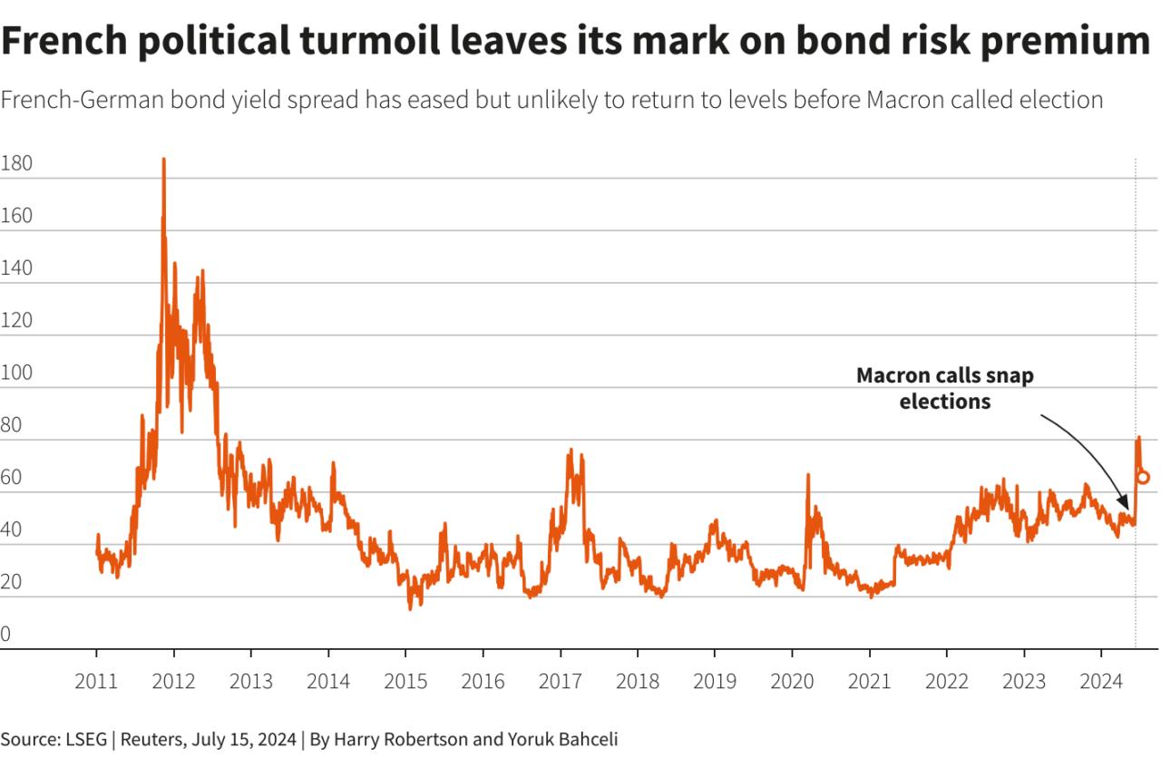 Το ασφάλιστρο κινδύνου των ομολόγων της Γαλλίας έναντι της Γερμανίας εκτινάχθηκε για λίγο τον περασμένο μήνα στο υψηλότερο επίπεδο από την κρίση χρέους του 2012, καθώς η ακροδεξιά κέρδισε έδαφος στην εκλογική κούρσα.