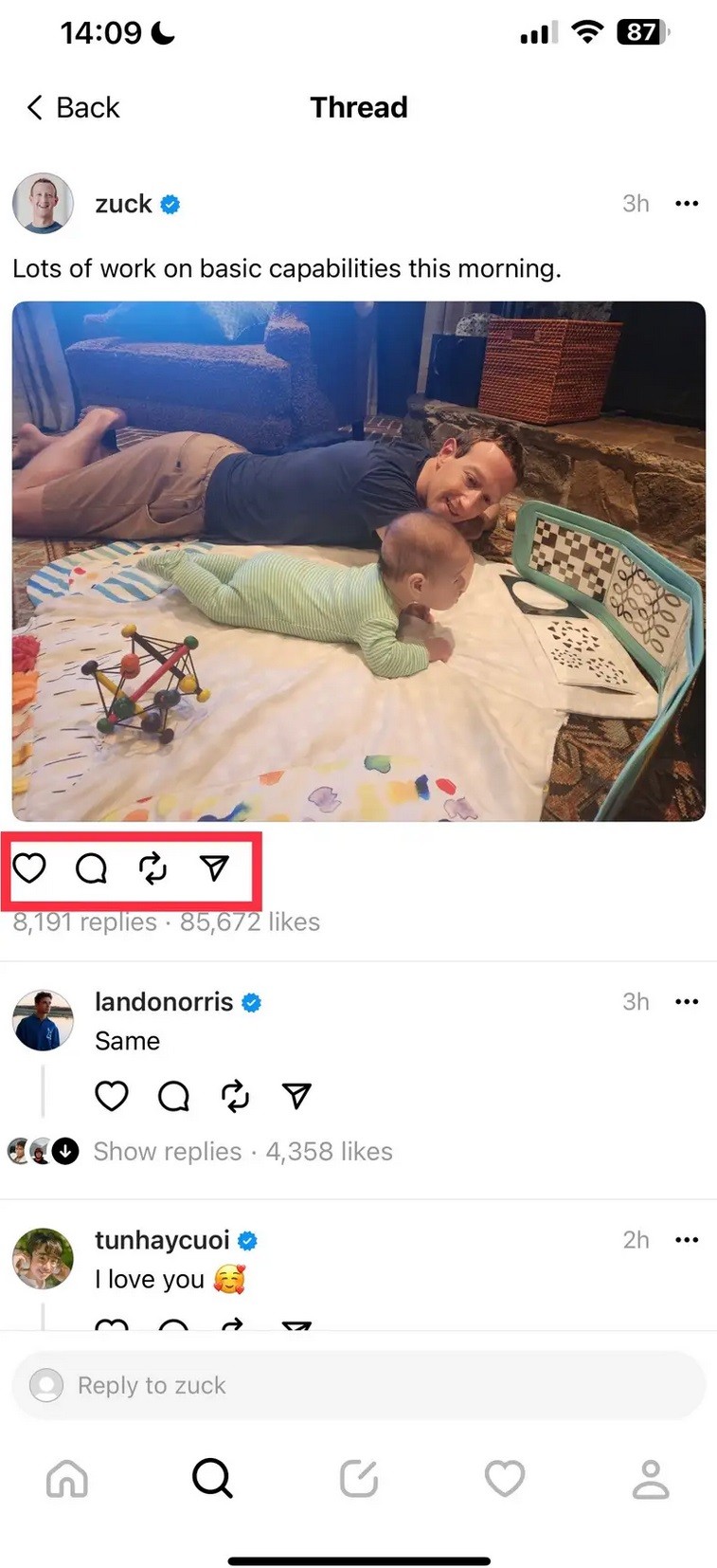 Εάν θέλετε να ακολουθήσετε και να απαντήσετε σε ένα thread, πατήστε την καρδούλα και μετά το κουμπί διαλόγου. Για repost μίας ανάρτησης πατήστε το κουμπί της «ανακύκλωσης».