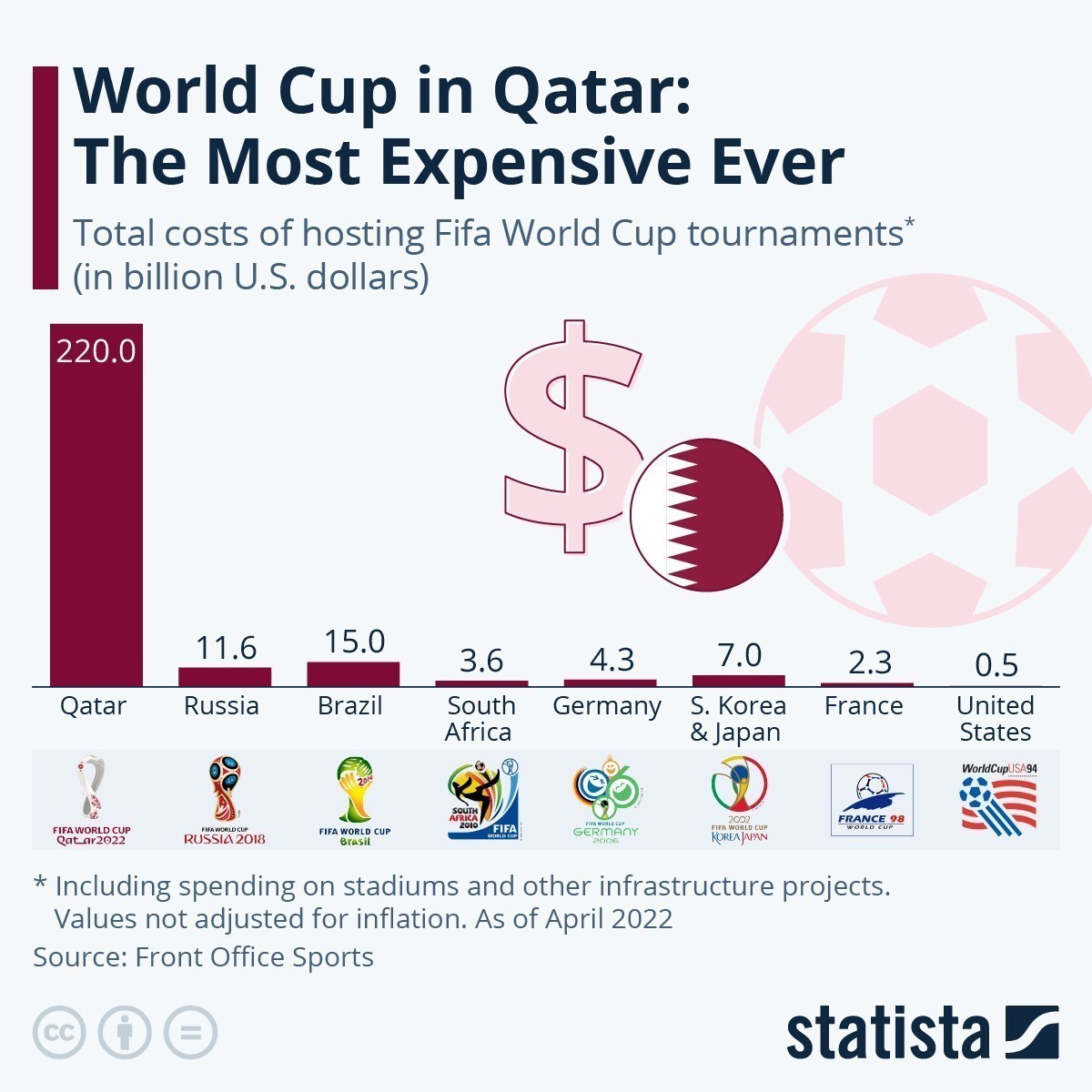 Το συνολικό κόστος για το πρώτο αραβικό Μουντιάλ εκτιμάται στο αστρονομικό ποσό των 220 δισ. δολαρίων. Για να γίνει αντιληπτό το μέγεθος, αξίζει να σημειωθεί ότι το κόστος για τη διοργάνωση του 2006 στη Γερμανία δεν είχε ξεπεράσει τα 4,3 δισ. δολάρια.