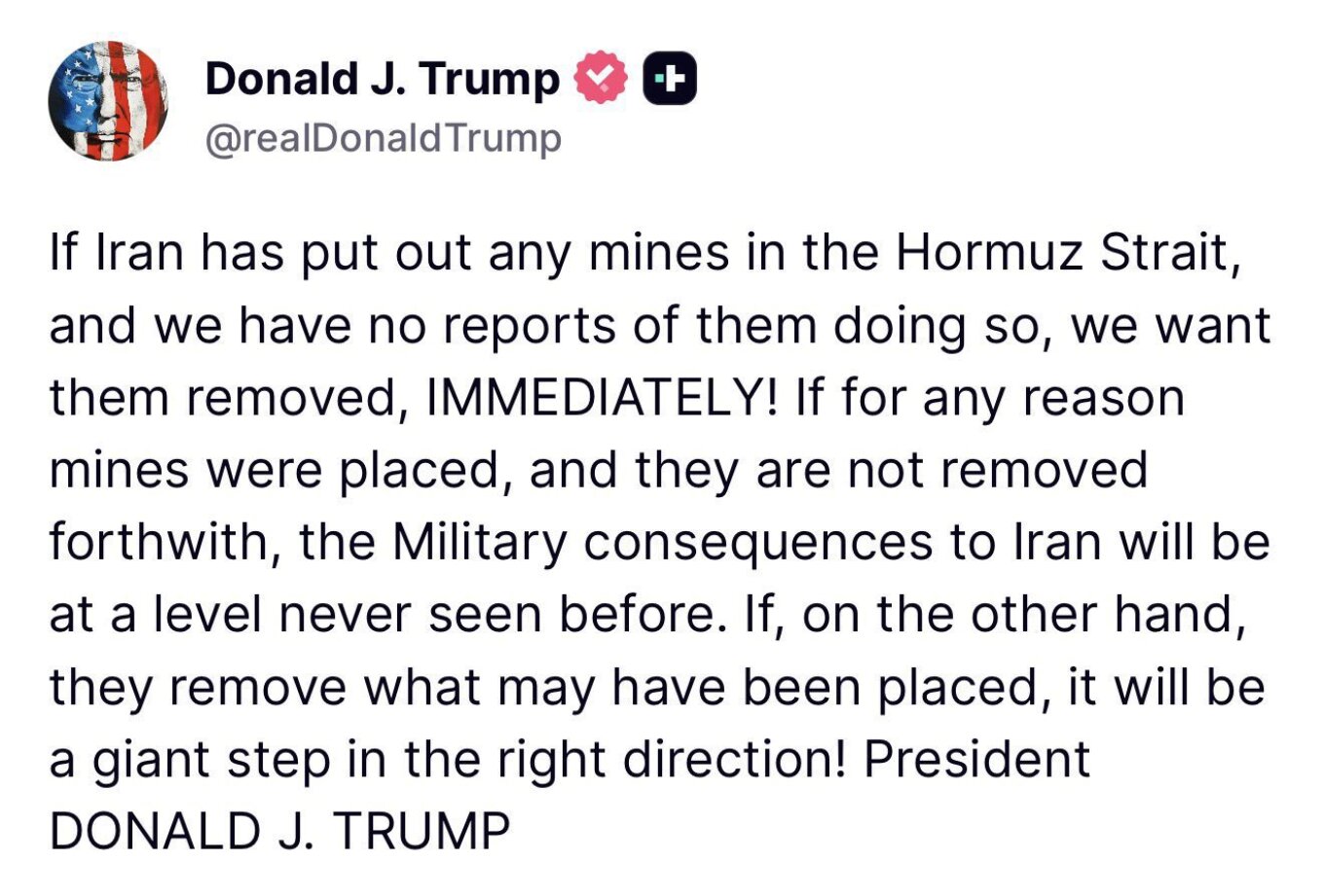 «Εάν το Ιράν έχει τοποθετήσει νάρκες στο Στενό του Χορμούζ – και δεν έχουμε αναφορές ότι το έκαναν – θέλουμε να τις απομακρύνουν ΑΜΕΣΩΣ», υπογραμμίζει ο Τραμπ σε ανάρτησή του στην πλατφόρμα Truth Social.