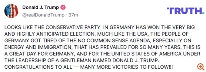 «ΦΑΙΝΕΤΑΙ ΟΤΙ ΤΟ ΣΥΝΤΗΡΗΤΙΚΟ ΚΟΜΜΑ ΣΤΗ ΓΕΡΜΑΝΙΑ ΚΕΡΔΙΣΕ ΤΙΣ ΠΟΛΥ ΜΕΓΑΛΕΣ ΚΑΙ ΠΟΛΥ ΑΝΑΜΕΝΟΜΕΝΕΣ ΕΚΛΟΓΕΣ. ΟΠΩΣ ΚΑΙ ΣΤΙΣ ΗΠΑ, Ο ΛΑΟΣ ΤΗΣ ΓΕΡΜΑΝΙΑΣ ΚΟΥΡΑΣΤΗΚΕ ΑΠΟ ΤΗΝ ΧΩΡΙΣ ΚΟΙΝΗ ΛΟΓΙΚΗ ΑΤΖΕΝΤΑ, ΙΔΙΑΙΤΕΡΑ ΓΙΑ ΤΗΝ ΕΝΕΡΓΕΙΑ ΚΑΙ ΤΗ ΜΕΤΑΝΑΣΤΕΥΣΗ, ΠΟΥ ΕΠΙΚΡΑΤΕΙ ΤΟΣΑ ΧΡΟΝΙΑ. ΑΥΤΗ ΕΙΝΑΙ ΜΙΑ ΜΕΓΑΛΗ ΗΜΕΡΑ ΓΙΑ ΤΗ ΓΕΡΜΑΝΙΑ ΚΑΙ ΓΙΑ ΤΙΣ ΗΝΩΜΕΝΕΣ ΠΟΛΙΤΕΙΕΣ ΤΗΣ ΑΜΕΡΙΚΗΣ ΥΠΟ ΤΗΝ ΗΓΕΣΙΑ ΕΝΟΣ ΚΥΡΙΟΥ ΟΝΟΜΑΖΟΜΕΝΟΥ ΝΤΟΝΑΛΝΤ ΤΖΕΪ ΤΡΑΜΠ. ΣΥΓΧΑΡΗΤΗΡΙΑ ΣΕ ΟΛΟΥΣ — ΑΚΟΛΟΥΘΟΥΝ ΑΚΟΜΑ ΠΟΛΛΕΣ ΝΙΚΕΣ!!!»