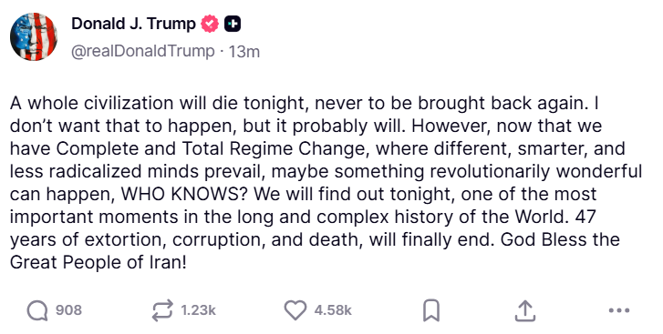 Η ανάρτηση του Αμερικανού προέδρου: «Ένας ολόκληρος πολιτισμός θα χαθεί απόψε και δεν θα ξαναγυρίσει ποτέ. Δεν θέλω να συμβεί αυτό, αλλά πιθανότατα θα συμβεί. Ωστόσο, τώρα που έχουμε Πλήρη και Ολική Αλλαγή Καθεστώτος, όπου επικρατούν διαφορετικές, πιο έξυπνες και λιγότερο ριζοσπαστικές σκέψεις, ίσως να συμβεί κάτι επαναστατικά υπέροχο, ΠΟΙΟΣ ΞΕΡΕΙ; Θα το μάθουμε απόψε, σε μια από τις πιο σημαντικές στιγμές της μακράς και περίπλοκης ιστορίας του Κόσμου. 47 χρόνια εκβιασμών, διαφθοράς και θανάτου, θα τελειώσουν επιτέλους. Ο Θεός να ευλογεί τον Μεγάλο Λαό του Ιράν!».