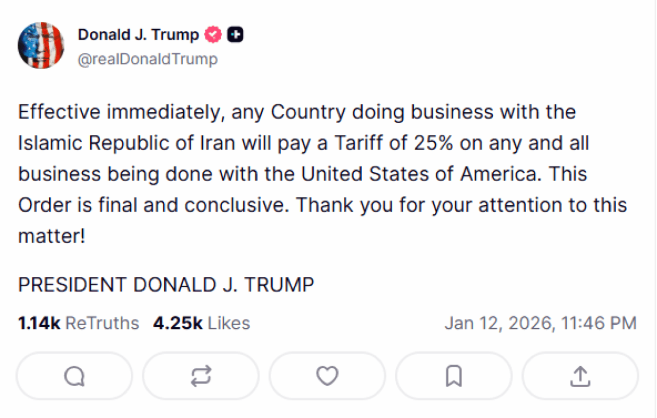 Ο Ντόναλντ Τραμπ ανακοίνωσε χθες Δευτέρα (12/1) μέσω Truth Social ότι οποιαδήποτε χώρα έχει εμπορικές συναλλαγές με το Ιράν θα υποστεί επιπρόσθετους τελωνειακούς δασμούς 25% από τις ΗΠΑ, απόφαση που χαρακτήρισε «οριστική», διευκρινίζοντας ότι «τίθεται σε ισχύ άμεσα».