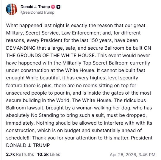 Σε ανάρτησή του στο Truth Social, ο πρόεδρος των ΗΠΑ υποστήριξε πως το περιστατικό δεν θα είχε γίνει, αν είχε ήδη ολοκληρωθεί η αίθουσα χορού που κατασκευάζεται στην ανατολική πλευρά του Λευκού Οίκου.