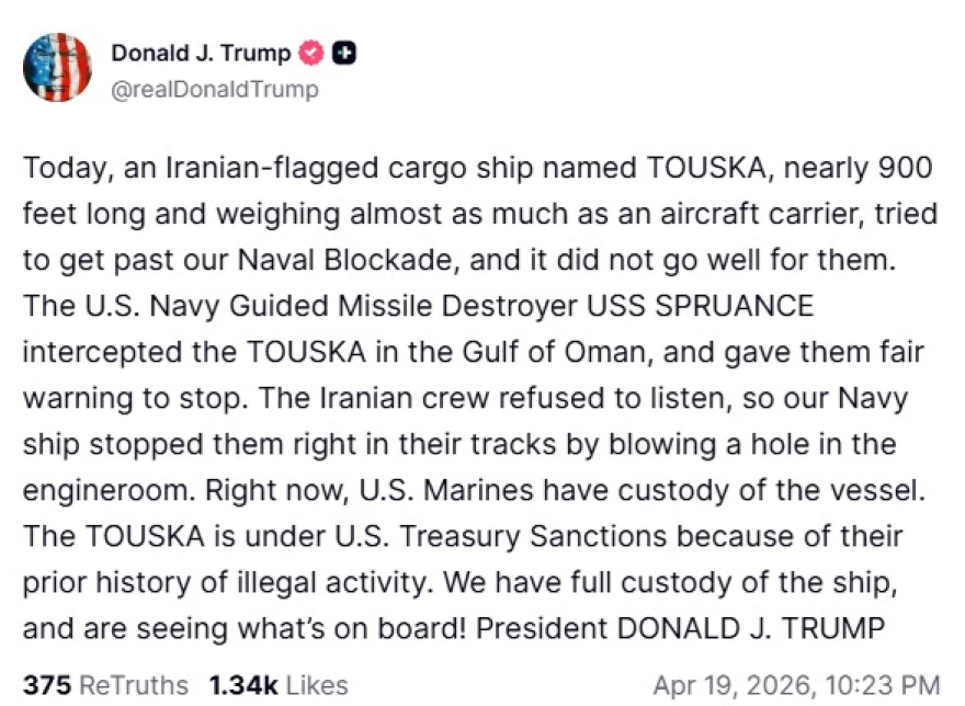 Σε ανάρτησή του, ο Αμερικανός πρόεδρος ανέφερε ότι το φορτηγό πλοίο TOUSKA, μήκους σχεδόν 274 μέτρα και βάρους σχεδόν όσο ένα αεροπλανοφόρο, επιχείρησε να περάσει τον ναυτικό αποκλεισμό που έχει επιβληθεί από τις ΗΠΑ. Σύμφωνα με τον ίδιο, το αντιτορπιλικό USS Spruance του Πολεμικού Ναυτικού των ΗΠΑ, εξοπλισμένο με κατευθυνόμενα βλήματα, αναχαίτισε το TOUSKA στον Κόλπο του Ομάν και τους έδωσε σαφή προειδοποίηση να σταματήσουν.