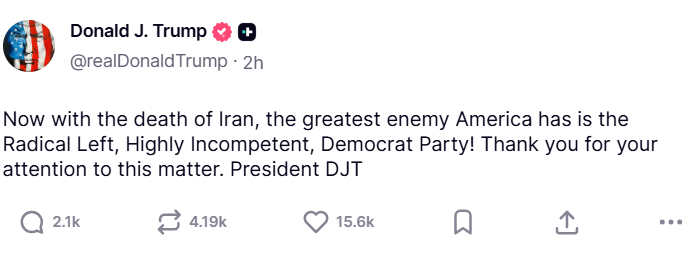 «Τώρα με τον θάνατο του Ιράν, ο μεγαλύτερος εχθρός που έχει η Αμερική είναι η Ριζοσπαστική Αριστερά, το εξαιρετικά ανίκανο Δημοκρατικό Κόμμα!», γράφει και… μας ευχαριστεί για την προσοχή που δείξαμε.