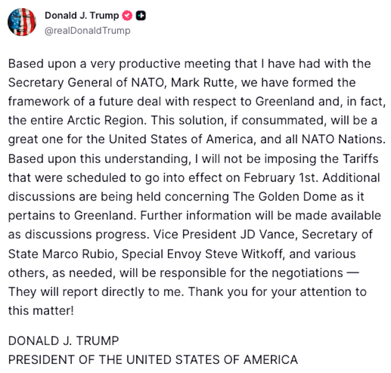 Σε ανάρτησή του στην πλατφόρμα Truth Social, ο Τραμπ ανέφερε ότι, μετά από «πολύ παραγωγική συνάντηση» με τον Ρούτε, οι δύο πλευρές κατέληξαν σε ένα πλαίσιο συμφωνίας που αφορά όχι μόνο τη Γροιλανδία, αλλά συνολικά την περιοχή της Αρκτικής. Όπως σημείωσε, εφόσον η συμφωνία ολοκληρωθεί, «θα είναι εξαιρετική για τις Ηνωμένες Πολιτείες και για όλες τις χώρες του ΝΑΤΟ».