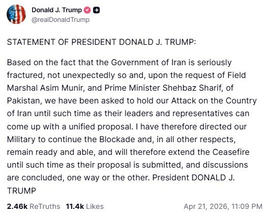 «Με δεδομένο ότι η κυβέρνηση του Ιράν είναι σοβαρά διχασμένη, κάτι που δεν προκαλεί έκπληξη, και κατόπιν αιτήματος του στρατάρχη Ασίμ Μουνίρ και του πρωθυπουργού του Πακιστάν Σεχμπάζ Σαρίφ, μας ζητήθηκε να αναστείλουμε την επίθεσή μας κατά του Ιράν μέχρις ότου οι ηγέτες και οι εκπρόσωποί του καταθέσουν μια ενιαία πρόταση» έγραψε ο Τραμπ στην πλατφόρμα Truth Social.