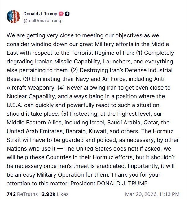 Και καταλήγει γράφοντας: Τα Στενά του Ορμούζ, θα πρέπει να φυλάσσονται και να ελέγχονται, όπως απαιτείται, από άλλα έθνη που το χρησιμοποιούν – οι Ηνωμένες Πολιτείες δεν τα χρησιμοποιούν! Εάν μας ζητηθεί, θα βοηθήσουμε αυτές τις χώρες στις προσπάθειές τους στο Ορμούζ, αλλά αυτό δεν θα πρέπει να είναι απαραίτητο μόλις εξαλειφθεί η απειλή του Ιράν. Είναι σημαντικό να σημειωθεί ότι θα είναι μια εύκολη στρατιωτική επιχείρηση για αυτές.