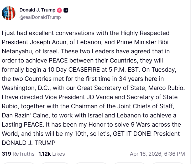 «Είχα εξαιρετικές συνομιλίες με τον ιδιαίτερα σεβαστό Πρόεδρο του Λιβάνου, Ζοζέφ Αούν, καθώς και με τον Πρωθυπουργό του Ισραήλ, Μπίμπι Νετανιάχου. Οι δύο αυτοί ηγέτες συμφώνησαν ότι, προκειμένου να επιτευχθεί ΕΙΡΗΝΗ μεταξύ των χωρών τους, θα ξεκινήσουν επίσημα μια 10ήμερη ΚΑΤΑΠΑΥΣΗ ΤΟΥ ΠΥΡΟΣ στις 5 μ.μ. (ώρα Ανατολικής Ακτής ΗΠΑ). Την Τρίτη, οι δύο χώρες συναντήθηκαν για πρώτη φορά έπειτα από 34 χρόνια εδώ στην Ουάσινγκτον, με τον σπουδαίο μας Υπουργό Εξωτερικών, Μάρκο Ρούμπιο. Έχω δώσει εντολή στον Αντιπρόεδρο Τζέι Ντι Βανς και στον Υπουργό Εξωτερικών Ρούμπιο, μαζί με τον Αρχηγό του Γενικού Επιτελείου Ενόπλων Δυνάμεων, Νταν «Ρέιζιν» Κέιν, να συνεργαστούν με το Ισραήλ και τον Λίβανο για την επίτευξη μιας διαρκούς ΕΙΡΗΝΗΣ. Είναι τιμή μου που έχω επιλύσει 9 πολέμους σε όλο τον κόσμο, και αυτός θα είναι ο 10ος, οπότε ας το ΟΛΟΚΛΗΡΩΣΟΥΜΕ!».