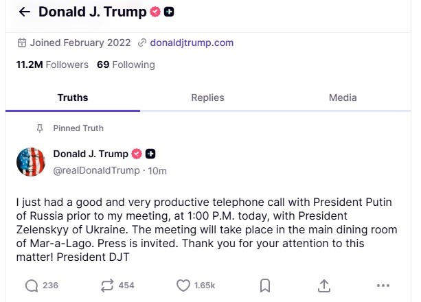 Η ανάρτηση του προέδρου αναφέρει: «Μόλις είχα μια καλή και πολύ παραγωγική τηλεφωνική συνομιλία με τον πρόεδρο Πούτιν πριν από τη συνάντησή μου, σήμερα στις 13:00 [20:00 ώρα Ελλάδος], με τον πρόεδρο Ζελένσκι της Ουκρανίας. Η συνάντηση θα πραγματοποιηθεί στην κεντρική τραπεζαρία του Μαρ-α-Λάγκο. Ο Τύπος είναι προσκεκλημένος. Σας ευχαριστώ για την προσοχή σας σε αυτό το θέμα! Πρόεδρος Τραμπ».Διαβάστε ακόμη