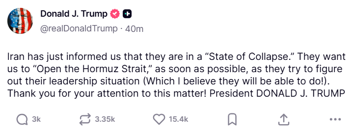 «Το Ιράν μόλις μας ενημέρωσε πως βρίσκονται σε “Κατάσταση Κατάρρευσης”. Θέλουν από εμάς να “Ανοίξουμε τα Στενά του Ορμούζ” όσο το δυνατόν συντομότερα, καθώς εκείνοι επιχειρούν να ξεκαθαρίσουν την κατάσταση με την ηγεσία τους (το οποίο πιστεύω πως θα καταφέρουν να κάνουν!)», γράφει ο Τραμπ στην ανάρτησή του.