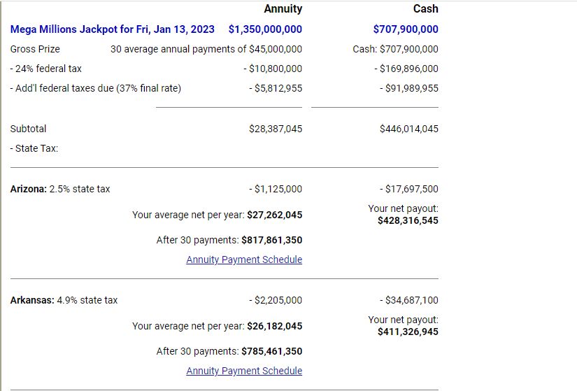 Σε περίπτωση εφάπαξ καταβολής, στο καθαρό ποσό των 707,9 εκατ. δολαρίων, όπως εξηγεί ο εξειδικευμένος στους υπολογισμούς των φόρων στη λοταρία ιστότοπος usamega.com, από τους ομοσπονδιακούς φόρους θα αφαιρεθούν 169,89 και 91,98 εκατομμύρια, αφήνοντας το συνολικό ποσό στα 446,014 εκατομμύρια δολάρια.