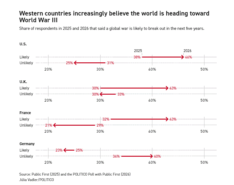 Οι δυτικές κοινωνίες πιστεύουν ολοένα και περισσότερο ότι ο κόσμος οδεύει προς έναν παγκόσμιο πόλεμο, σύμφωνα με τα αποτελέσματα της δημοσκόπησης The POLITICO Poll, που καταγράφει την αυξανόμενη ανησυχία της κοινής γνώμης για τον κίνδυνο και το κόστος μιας νέας εποχής συγκρούσεων.