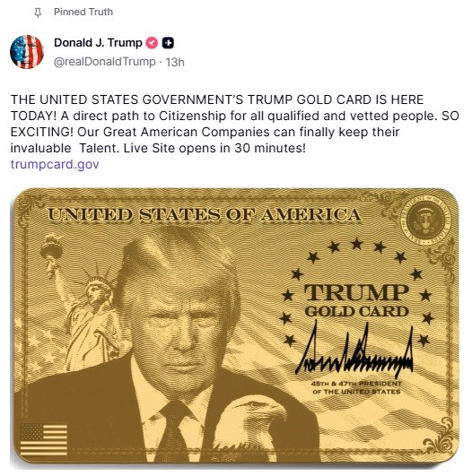 Η Trump Gold Card, που είχε ανακοινωθεί για πρώτη φορά νωρίτερα φέτος, αποτελεί μια αμερικανική βίζα που απονέμεται σε όσους μπορούν να αποδείξουν ότι θα προσφέρουν «ουσιαστικό όφελος» στη χώρα, σύμφωνα με την επίσημη ιστοσελίδα του προγράμματος.