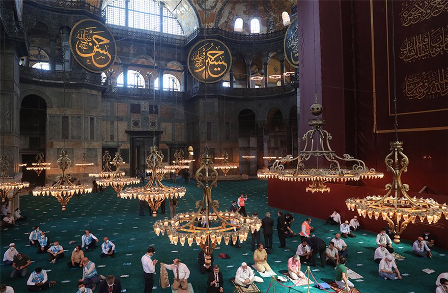 Στην Αγιά Σοφιά μπήκε λίγα λεπτά μετά τις δώδεκα το μεσημέρι ο Τούρκος Πρόεδρος Ρετζέπ Ταγίπ Ερντογάν, επευφημούμενος από τους χιλιάδες Τούρκους που έχουν συρρεύσει έξω από την Μεγάλη Εκκλησία. Ο Ερντογάν με ύφος σουλτάνου μπήκε στην Αγιά Σοφιά που πλέον είναι στρωμένη με πετρόλ χαλιά και πήρε τη θέση του στην πρώτη σειρά και γονάτισε όπως προβλέπει το τυπικό της μουσουλμανικής προσευχής πάνω στο ειδικό χαλί που χρησιμοποιούν για να προσεύχονται.
