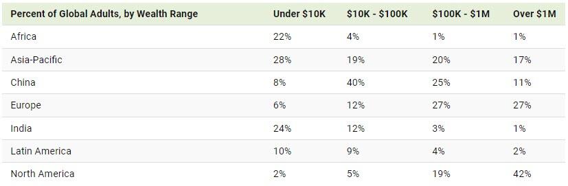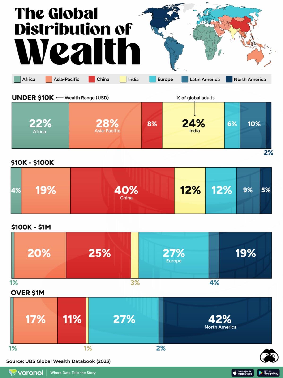 Οι Μάρκους Λου και Ντόροθι Νόιφελντ του Visual Capitalist δημιούργησαν το ακόλουθο γράφημα με βάση τα στοιχεία έκθεσης της UBS, αναδεικνύοντας το ποσοστό του πλούτου των ενηλίκων ανά τον πλανήτη.
