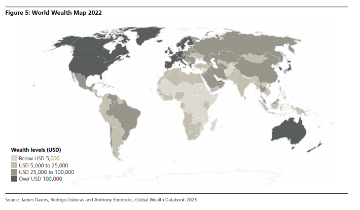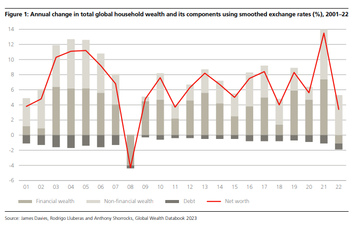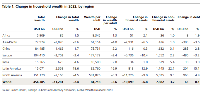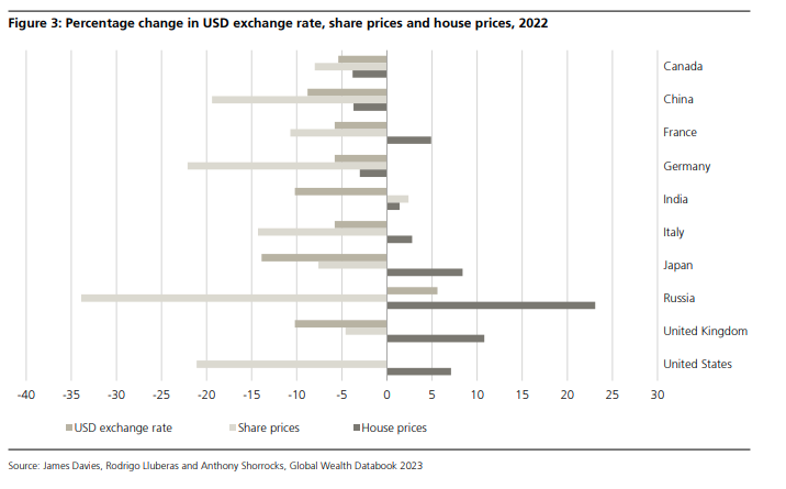 Αυτό, όμως, αντισταθμίστηκε από τον πληθωρισμό ο οποίος αύξησε την ονομαστική αξία του νομίσματος αυτού κατά παρόμοιο ποσό. Εκφρασμένες σε πραγματικά δολάρια ΗΠΑ με σταθερές συναλλαγματικές ισοτιμίες, οι χαμηλότερες αποτιμήσεις των περιουσιακών στοιχείων προκάλεσαν μείωση του συνολικού παγκόσμιου πλούτου κατά 2,6% το 2022 και μείωση του πλούτου ανά ενήλικα κατά 3,8%.