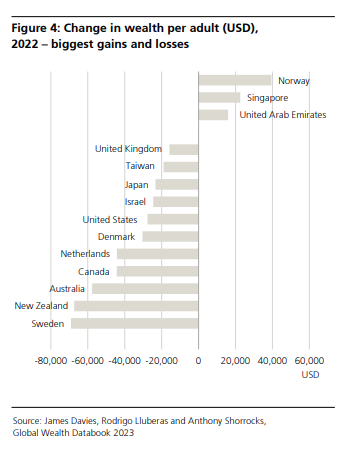 Όσον αφορά συγκεκριμένες χώρες, η UBS υποστηρίζει πως ο μέσος όρος πλούτου στη Σιγκαπούρη και τη Νορβηγία αυξήθηκε κατά $20.000, αν και οι αυξήσεις αυτές υστερούν σε σχέση με τις αντίστοιχες απώλειες των $40.000 στις ΗΠΑ, την Ολλανδία, τον Καναδά, την Αυστραλία, τη Νέα Ζηλανδία και τη Σουηδία.