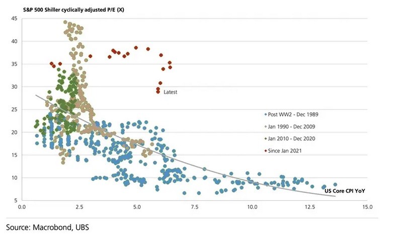 Η επικίνδυνη υψηλή αξιολόγηση των εισηγμένων εταιρειών συνδυασμένη με τον ιστορικά υψηλό πληθωρισμό αποτελεί απειλή για τις αγορές, σύμφωνα με τον Baweja. Ο κυκλικά προσαρμοσμένος δείκτης αναλογίας τιμής/κέρδους ανά μετοχή (P/E) του S&P 500 παραμένει σε υψηλά σημεία, ενώ ο δομικός πληθωρισμός βρίσκεται σε υψηλό 40ετίας, σύμφωνα με τη UBS.