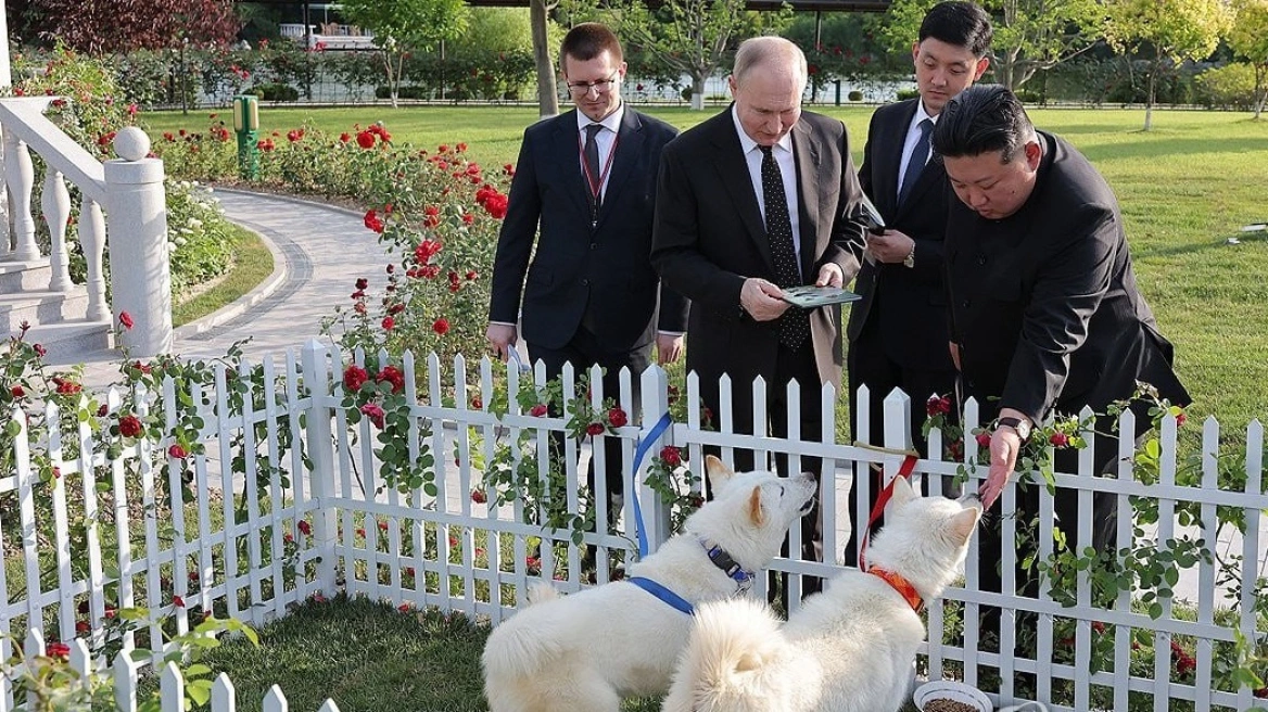Οι Κιμ και Πούτιν φαίνονται να κοιτάζουν τους δύο σκύλους, οι οποίοι είναι δεμένοι σ’ ένα φράκτη καλυμμένο με τριαντάφυλλα, σε εικόνες που προβλήθηκαν σήμερα από την ελεγχόμενη από το κράτος Κορεατική Κεντρική Τηλεόραση.